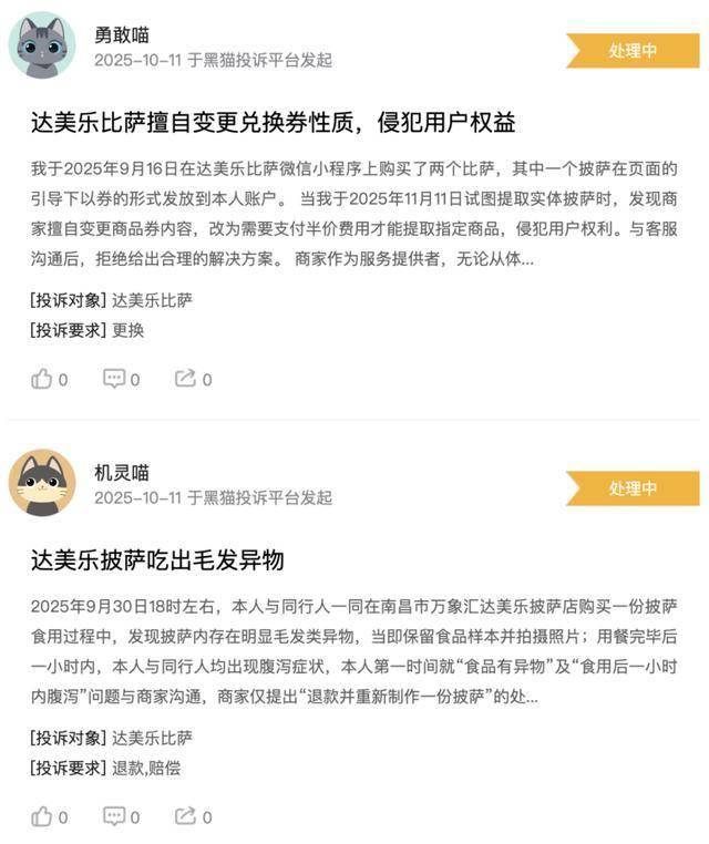 截止10月14日,黑猫赞扬平台上,关于达美乐披萨的赞扬累计达800条,内容包罗优惠券悄无声息过时导致无法利用;不开;办事立场欠好;食物平安等等。此中,优惠券悄无声息过时的环境较为遍及,很多消费者反映正在不知情的环境下,优惠券就已失效,影响了消费体验。